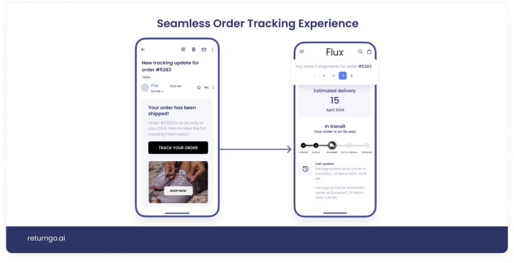 For order tracking, Flux had been using only Shopify’s basic email notifications which provided minimal communication to customers. These emails simply redirected customers to an external carrier website, taking them away from Flux Footwear’s website and branding. Customers were unable to proactively track orders in one centralized place, leading to frustration and a high volume of “Where Is My Order?” (WISMO) inquiries flooding the customer support team.