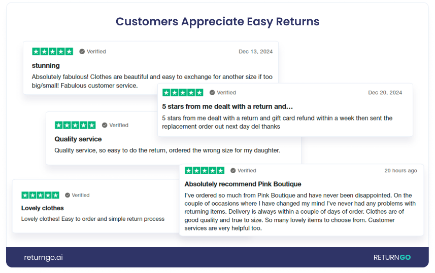Pink Boutique has seen great feedback from shoppers about the automated returns process, with many 5-star reviews praising the smooth returns experience, ease of returning items, and fast refunds.