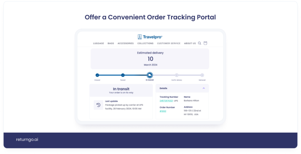 Travelpro prioritizes accessibility and transparency in its order tracking process, making the portal easily accessible through confirmation emails and website navigation. This increased transparency and convenient order tracking portal provides a better customer experience.